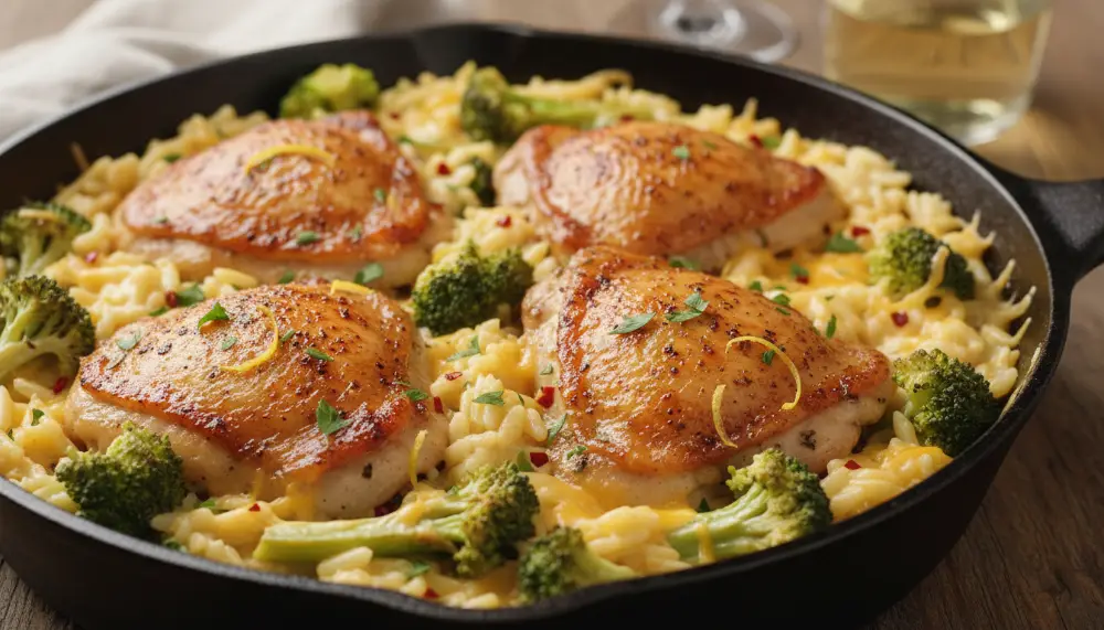 The Culinary Heritage of the Savory Chicken Thighs with Cheesy Broccoli Orzo Skillet