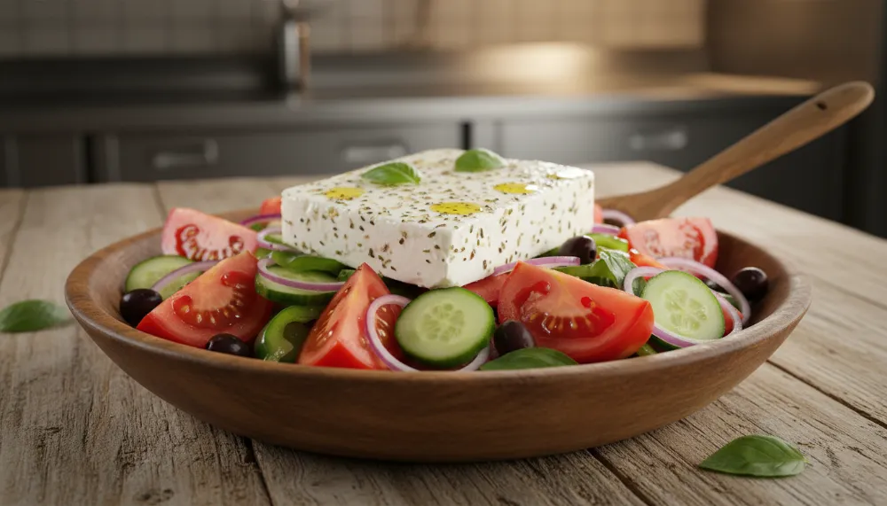 In many Western versions of this dish, you will see feta crumbled into tiny bits. This is a culinary sacrilege in the eyes of a traditionalist. In a proper Classic Greek Salad with Feta, the cheese is served as a single, thick slab resting majestically atop the vegetables. This allows the diner to break off pieces as they eat, controlling the saltiness of each bite. The quality of the feta is paramount. Authentic Greek feta is made from sheep milk or a blend of sheep and goat milk, providing a creamy yet tangy profile that cow milk feta simply cannot replicate. The cheese should be brined, ensuring it stays moist and retains its signature sharpness.