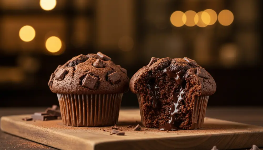 One of the most frequent questions regarding Double Chocolate Muffins is how to get the tops to rise so high. The “Temperature Burst” method is a professional trick used by high-end bakeries. By starting the bake at 425°F, you create an immediate burst of steam within the batter. This “oven spring” forces the muffin upward rapidly. After five minutes, dropping the temperature to 350°F allows the heat to reach the center of the Double Chocolate Muffins slowly, ensuring the inside is fully cooked while the outside remains tender rather than burnt.