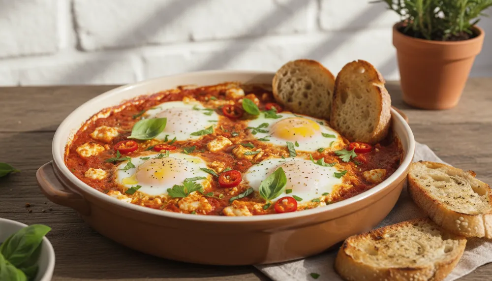 The Mediterranean Baked Feta Eggs – Easy Shakshuka Twist is best served straight from the pan. Traditionalists will use warm pita or crusty sourdough to scoop up the sauce and yolks. If you find yourself with leftovers, the tomato and feta base stores beautifully in an airtight container for up to three days. Simply reheat the base on the stove and crack fresh eggs into it when you are ready to eat again. Avoid reheating the eggs themselves, as they tend to become rubbery in the microwave.