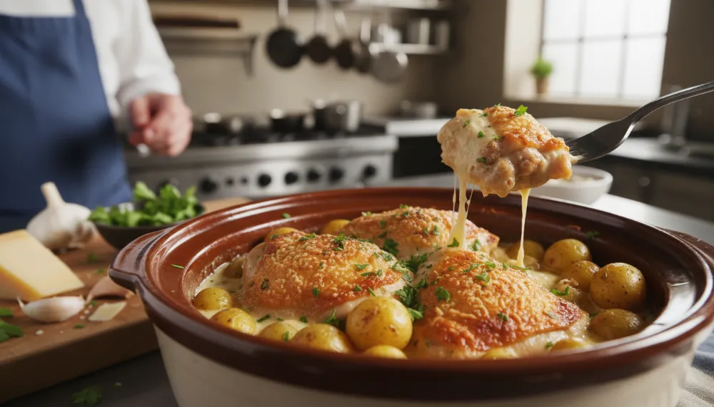 For a lighter, vegetable-forward version, you can add green beans or sliced carrots. Add the green beans during the last 60 minutes of cooking to maintain a slight crunch. Carrots, however, should be layered at the very bottom with the potatoes, as they take longer to soften and will absorb the savory juices from the chicken. To add a bit of heat, incorporate smoked paprika or crushed red pepper flakes into your potato seasoning, this adds a back-of-the-throat warmth that complements the sharp parmesan cheese perfectly.